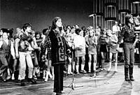 | Kinderzangfestival KRO, 12 juni 1971 De finale van de jaarlijkse zangwedstrijd voor schoolkoren. Enkele koorleden wisten zich te herinneren dat zij tijdens een finale zowel opgetreden, gepresenteerd als gejureerd hebben. | ![]() |