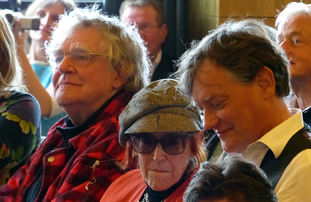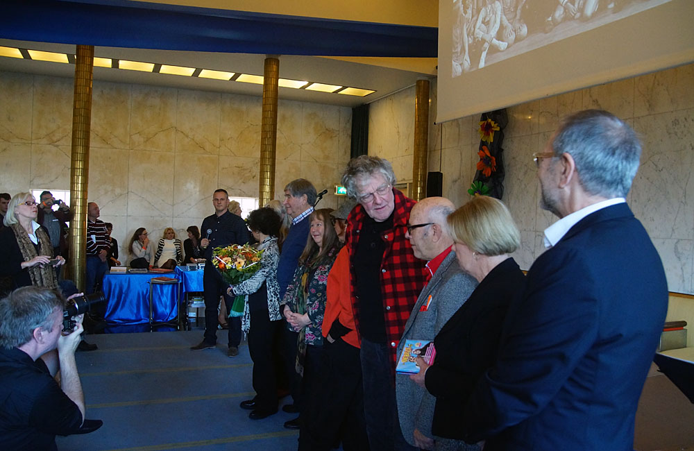 Slechts een handjevol aanwezigen wist dat er nog een verrassing voor Harrie Geelen was. In het diepste geheim hadden zij een half jaar geleden op initiatief van Ria Tammer een brief geschreven aan de burgemeester van Hilversum waarin zij op persoonlijke titel hadden verwoord waarom zij vonden dat Harrie Geelen een lintje had verdiend. In oktober kwam het verlossende woord, Harrie kreeg een Koninklijke onderscheiding voor zijn gehele oeuvre en zelfs een hoge: Ridder in de Orde van de Nederlandse Leeuw. Burgemeester Pieter Broertjes sprak de nieuwe ridder toe en spelde hem daarna namens koning Willem Alexander het lintje op.Klik op onderstaande regels om de gehele toespraak van de burgemeester te lezen en voor een overzicht van het oeuvre van Harrie Geelen tot nu toe.